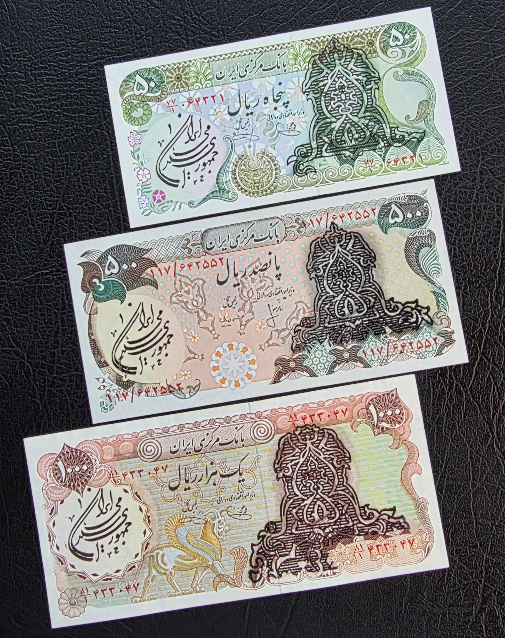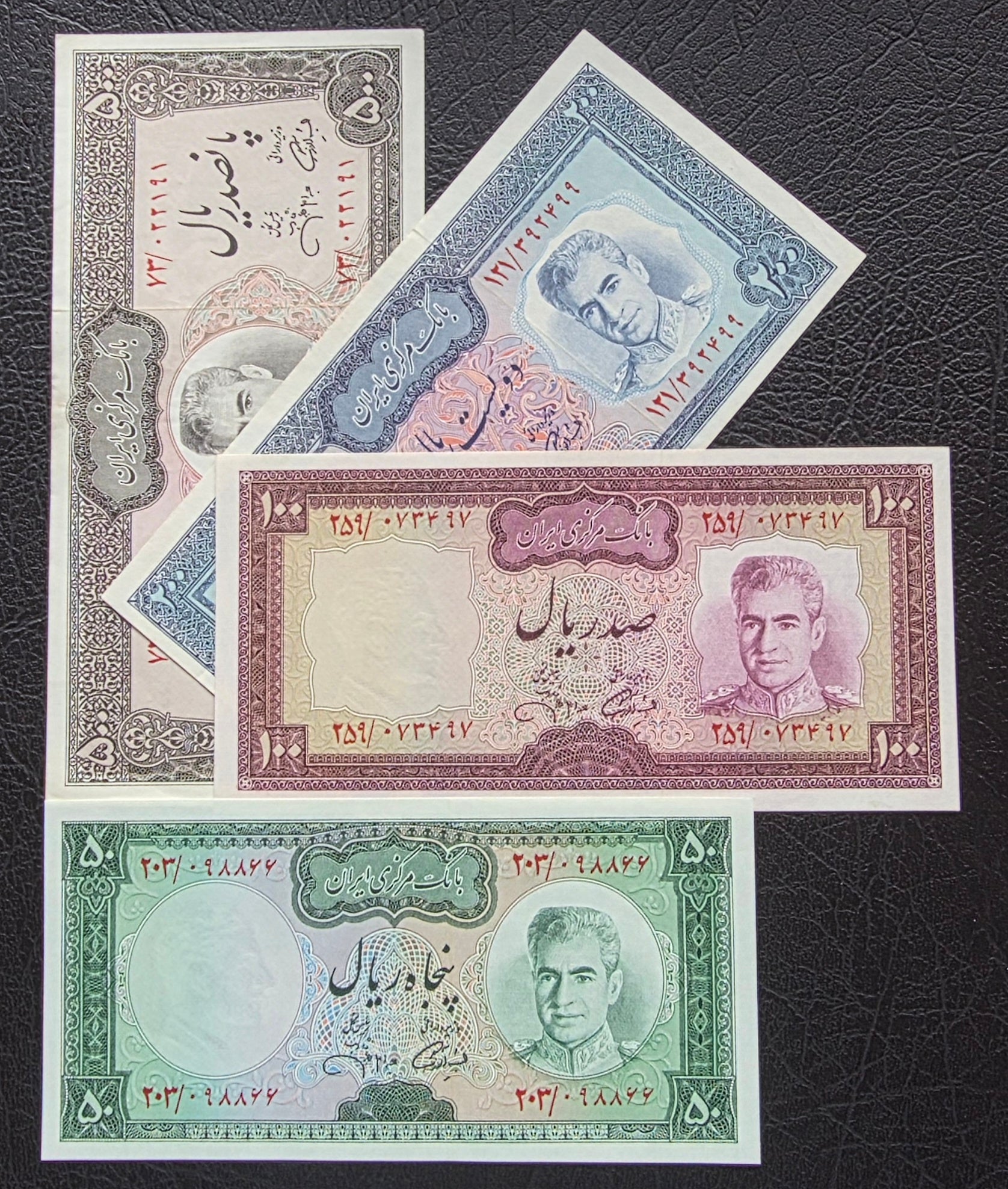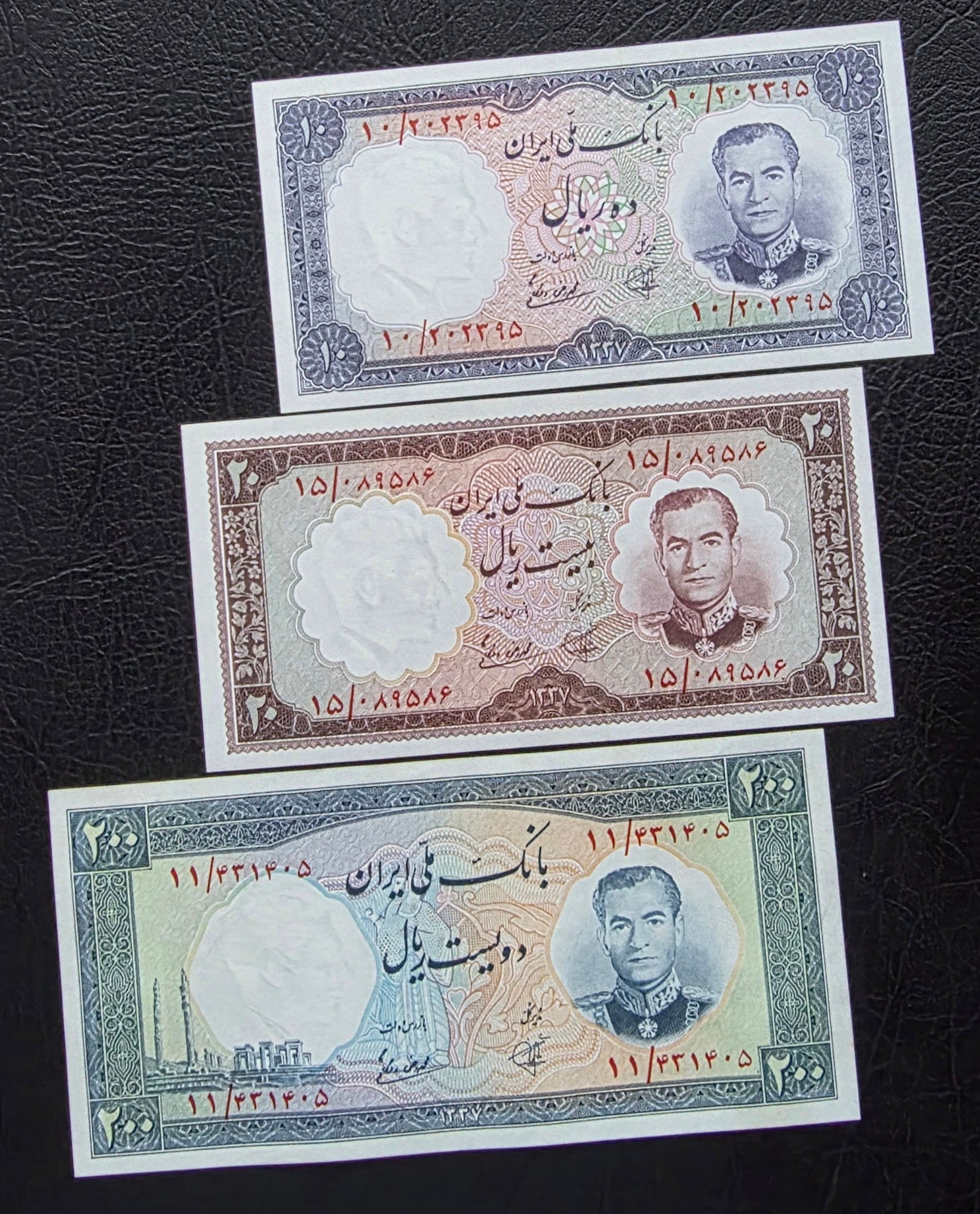 Full set of 10, 20, and 200 Rials 1958 Monarchy Portrait note Gem Uncirculated (UNC)
