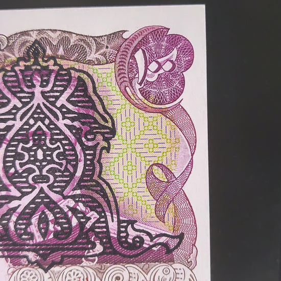 Banknotes issued between late 1979 and 1980 are known as surcharge notes, distinguished by the King's portrait being obscured with arabesque overprint. This modification was carried out by the renowned printing company De La Rue. These notes feature a variety of ink colours, including light green, dark green, and black. Due to their brief circulation period, they are considered rare and highly collectible.