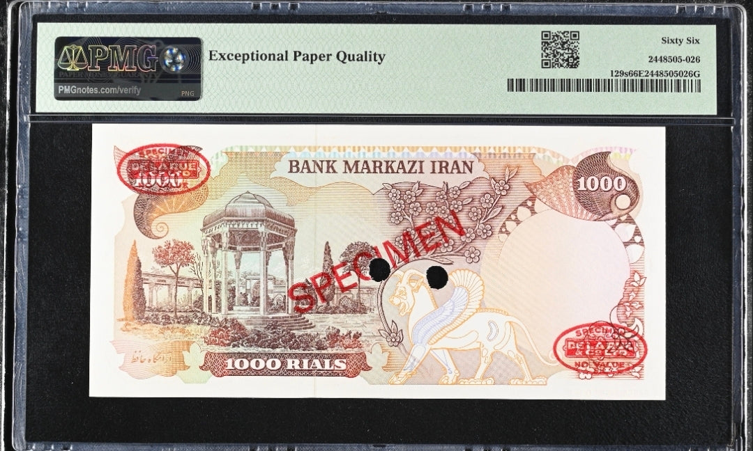 1000 Rials banknote from 1981, professionally graded by PMG as 66 EPQ. This specimen note, one of only 999 issued, is exceptionally rare and highly sought after by collectors. The corresponding circulating notes in this series are also considered valuable due to the presence of the Lion and Sun emblem watermark.