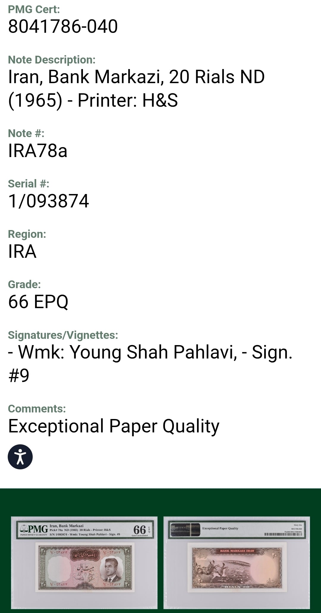 20 Rials 1965 Pahlavi Persian notes Uncirculated UNC PMG 66 EPQ P 78a