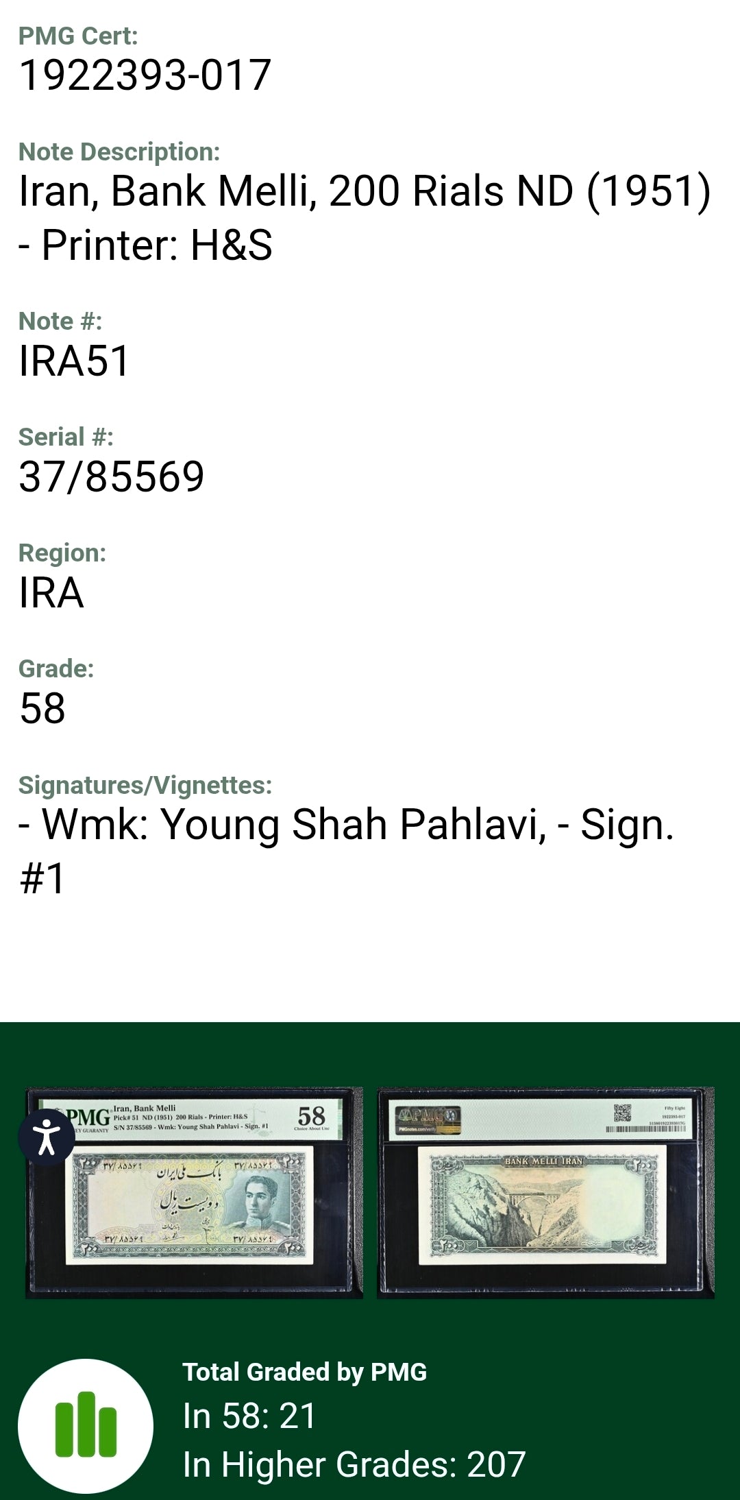 You are kindly buying one single note from 1951 in an About Uncirculated quality, graded by PMG (58). Please see the other listing for 10, 20, 100 and 500 Rials. This set is popular as the third series set.The raw notes are also available.