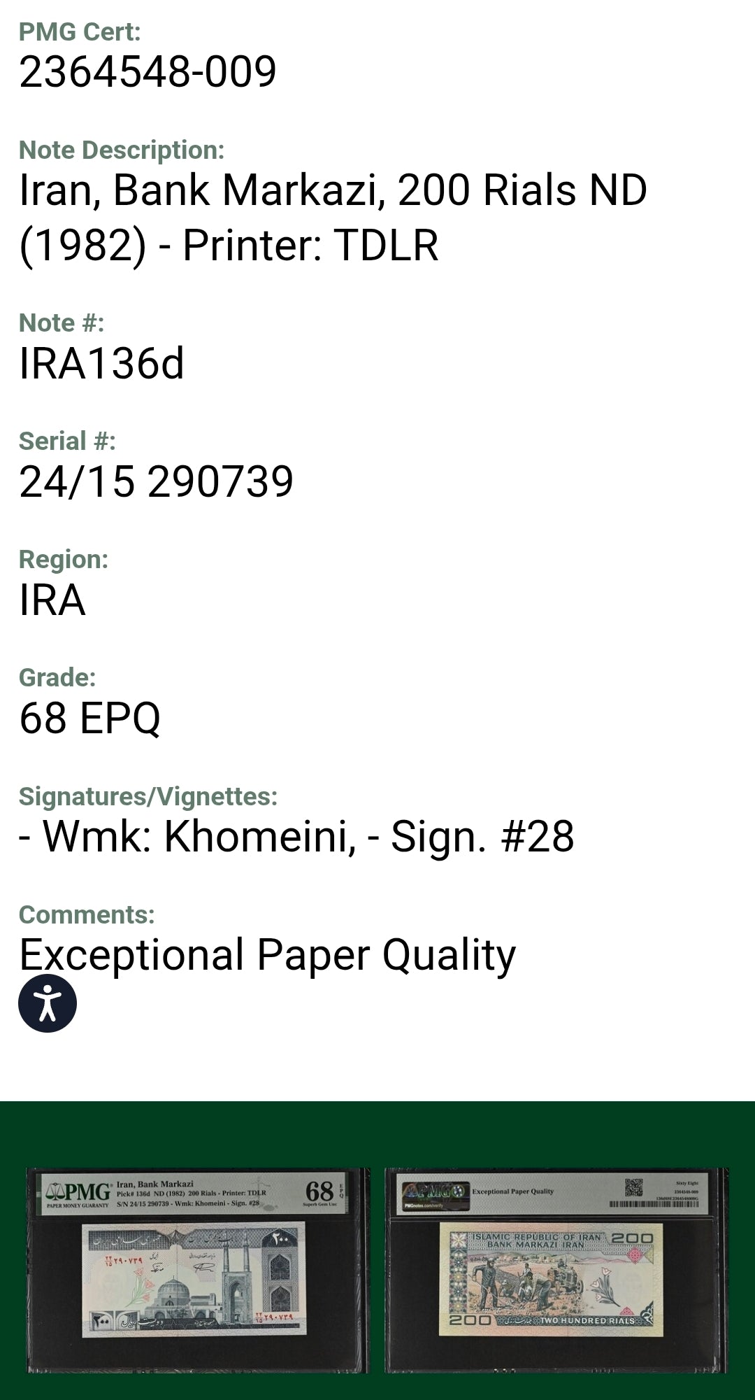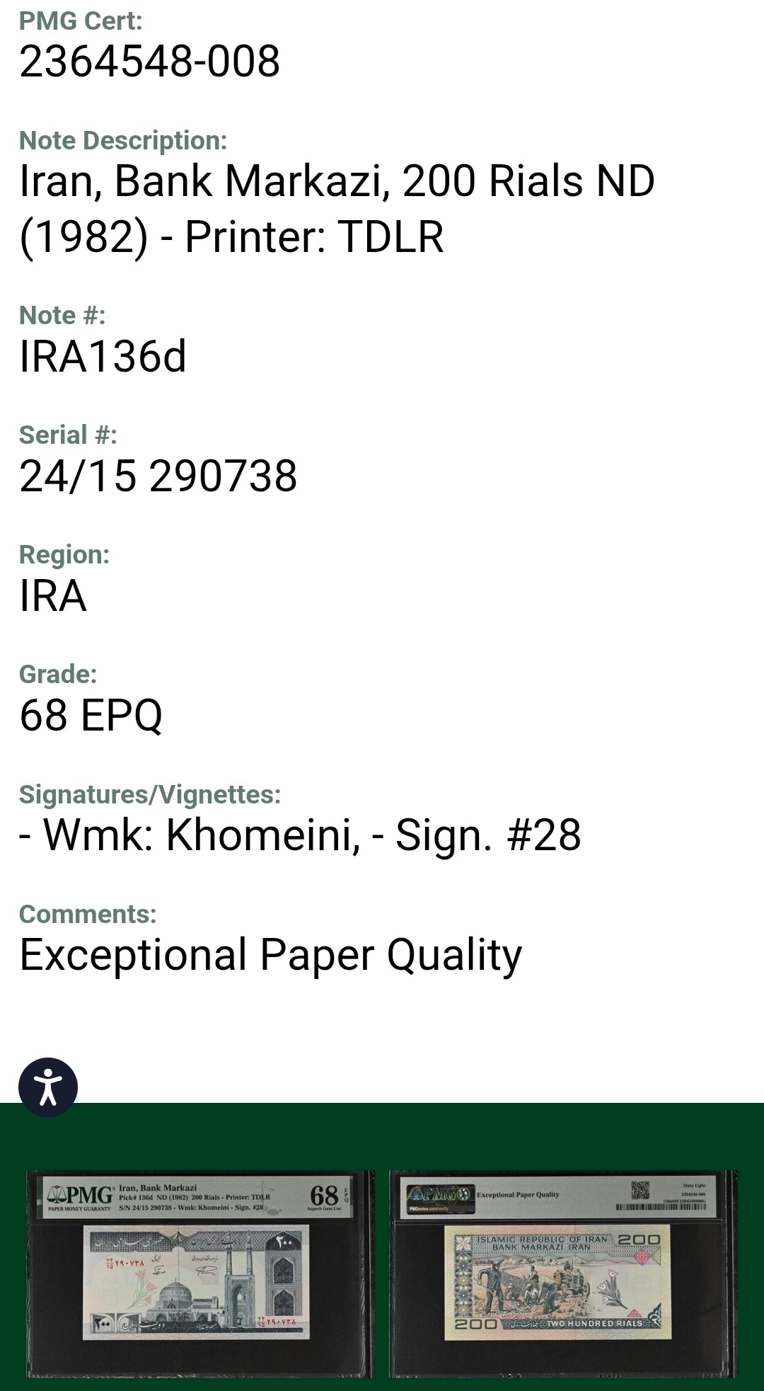200 Rials 1982 Iran Persain Banknote PMG 68 EPQ Superb Gem Uncirculated P 136d (two consecutive notes) Top pop