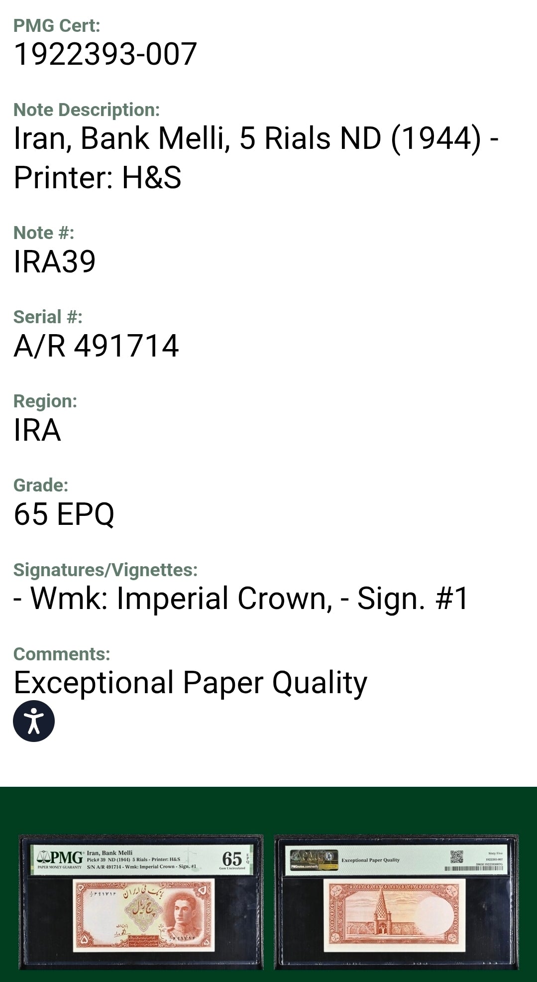 5 Rials banknote from 1944, professionally graded by PMG as 65 EPQ (Exceptional Paper Quality), ensuring its superb condition and value to collectors. This note belongs to the historically significant First series of Pahlavi II, which also includes the 10, 20, and 100 Rials denominations.