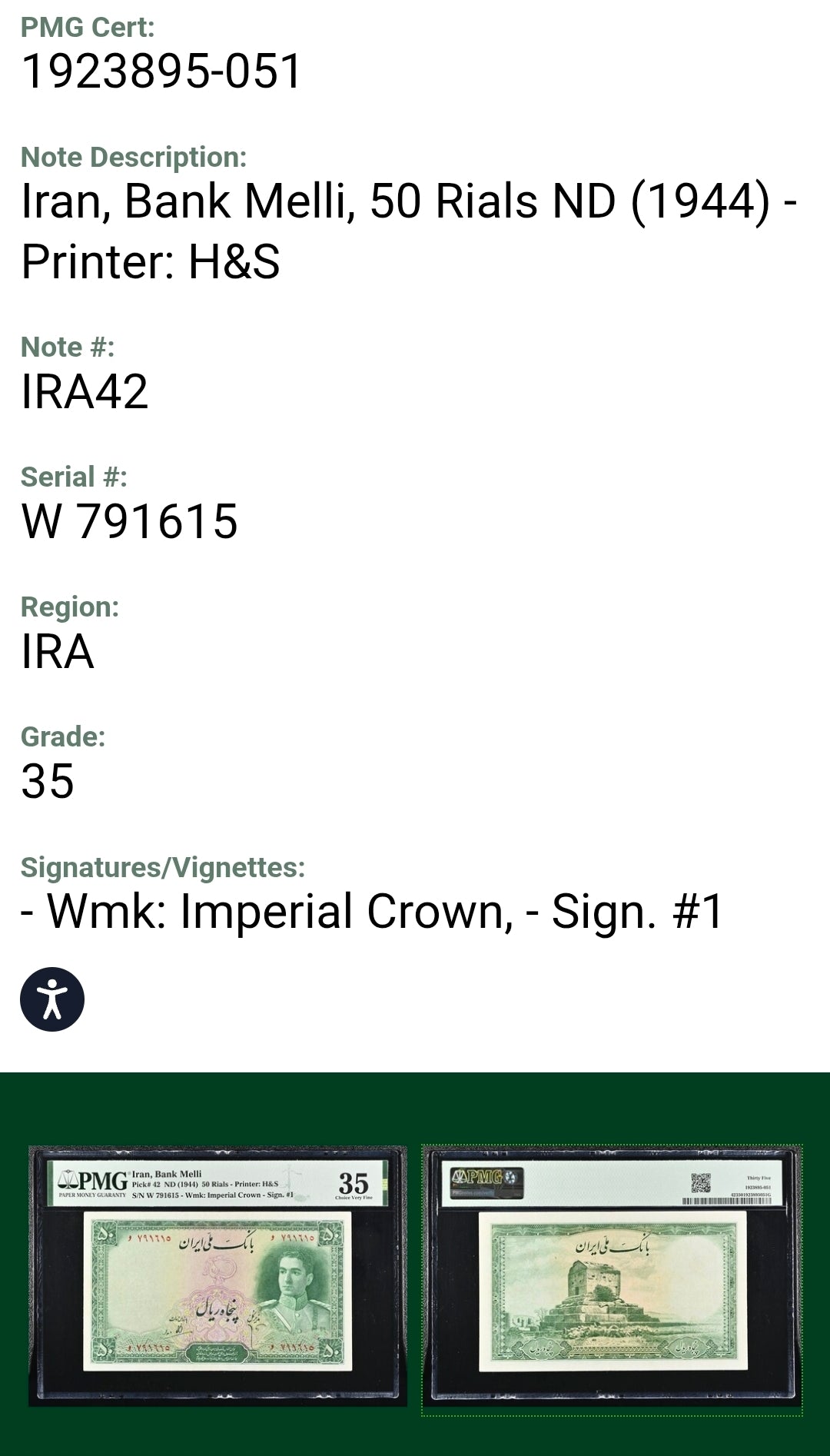 50 Rials banknote from 1944, professionally graded by PMG as 35. This note belongs to the historically significant second series of the King II, which also includes the 50, 100, 500 and 1000 Rials denominations.