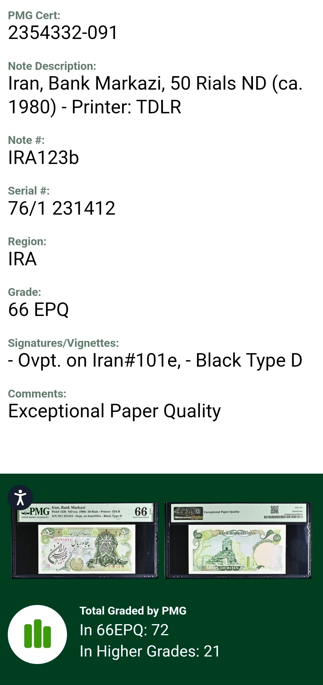 Be sure to also review the raw (ungraded) notes from this series. A grade of 66 EPQ is considered excellent for overprint notes, especially since they underwent a technically demanding two-step printing process (before and after the 1979 revolution).