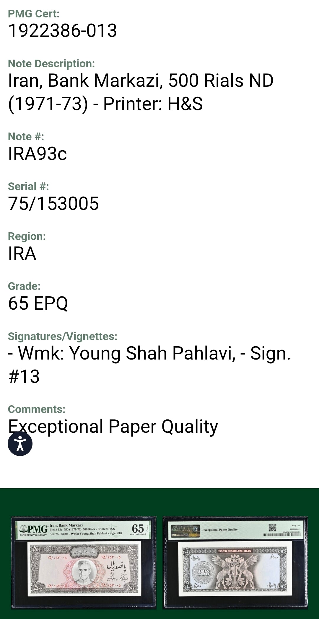 You are kindly buying one 500 Rials note from 1971 (Dollar design) in an exceptional quality (PMG 65 EPQ). The raw notes are also available.
