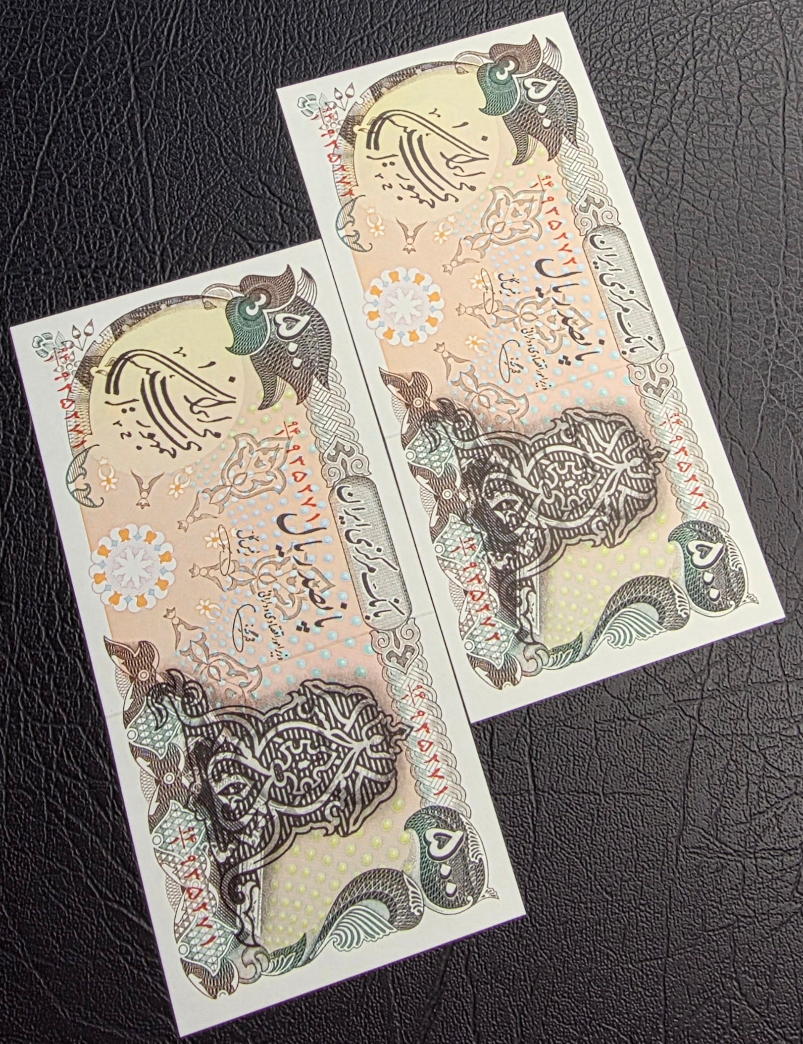 Banknotes issued between late 1979 and 1980 are known as surcharge notes, distinguished by the King's portrait being obscured with arabesque overprint. This modification was carried out by the renowned printing company De La Rue. These notes feature a variety of ink colours, including light green, dark green, and black (see the last image as a comparison). Due to their brief circulation period, they are considered rare and highly collectible.