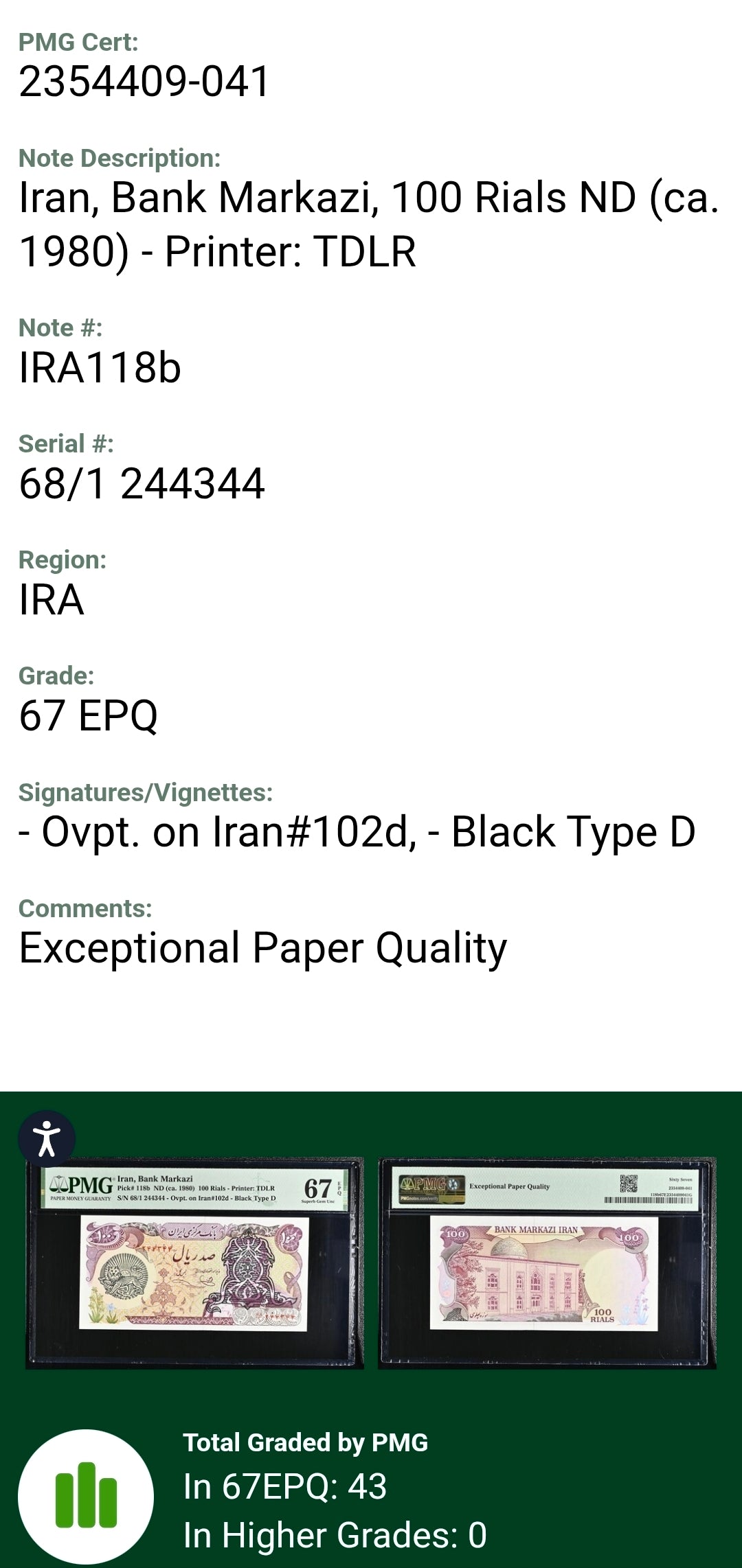 100 Rials 1979 Pahlavi Overprint Surcharge Persian note Uncirculated PMG 67 EPQ TOP POP P 118b
