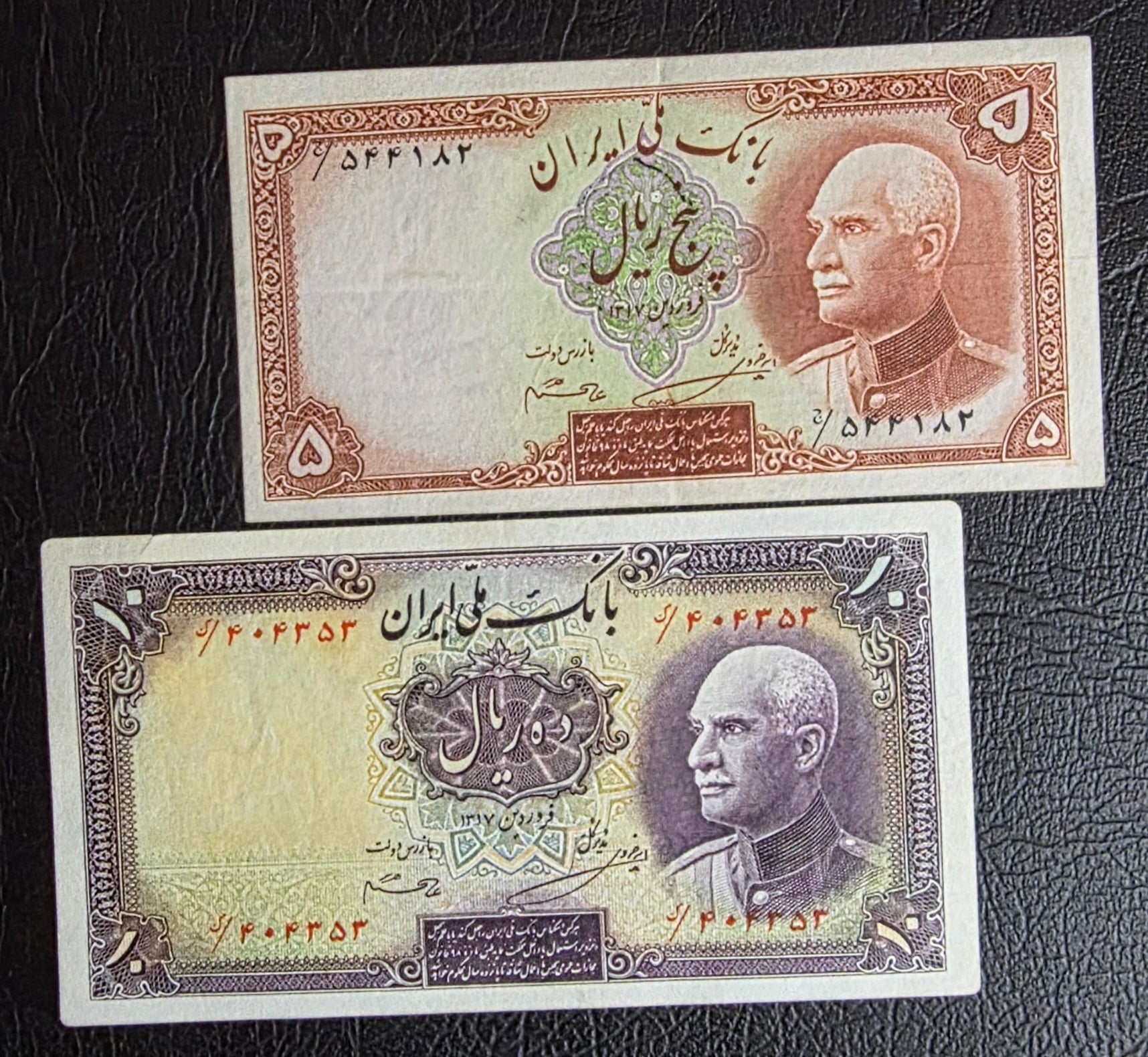 Set of 5 and 10 Rials 1938 Monarchy Portrait note (rare) Extremely Fine (XF) (1321 Blue seal)