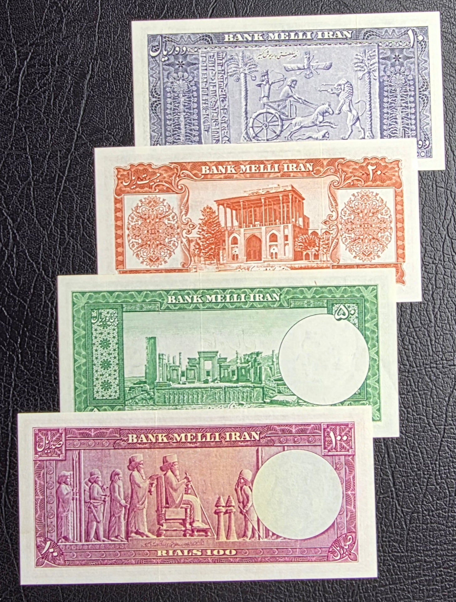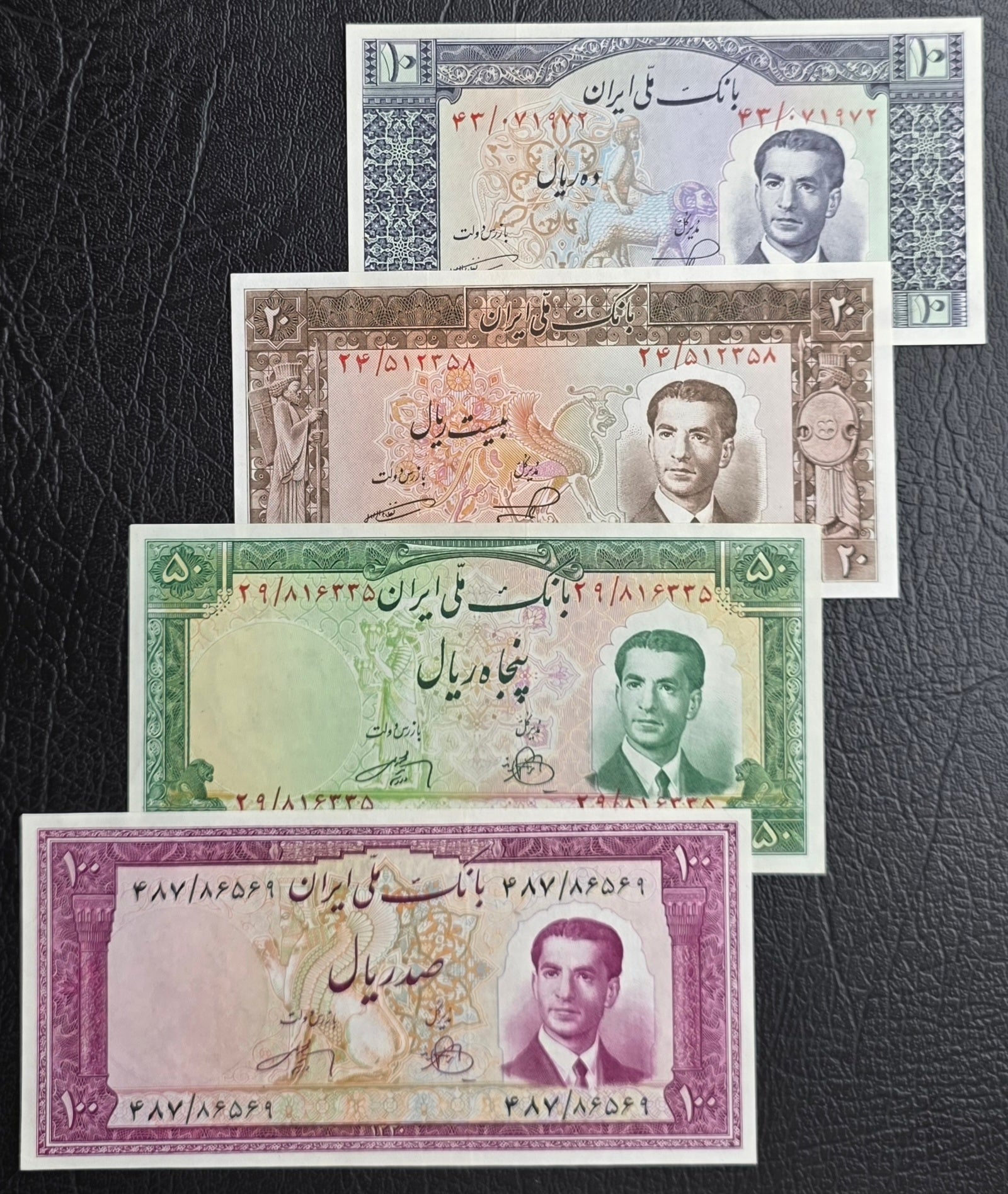 Set of 10, 20, 50 and 100 Rials 1953 Pahlavi Persian notes Uncirculated UNC